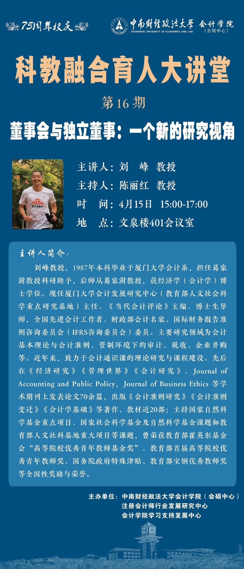 本次我们诚挚邀请厦门大学会计发展研究中心主任刘峰教授作为主讲嘉宾,为我们带来第16期科教融合育人大讲堂。