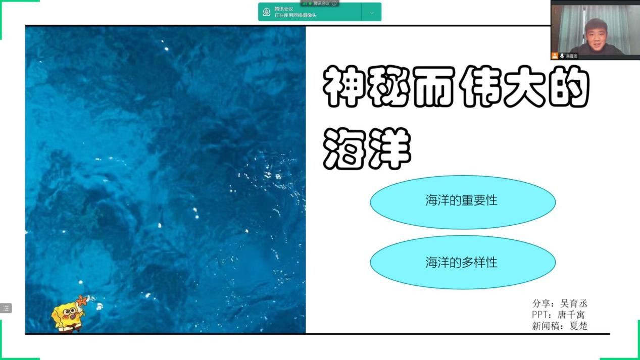 (通讯员 夏楚)2023年3月21日下午,会计学院学生党员志愿服务活动团成员通过腾讯会议平台给云南省盐津县箭坝小学二年级师生带来了一节以“海洋生物科普”为主题的“云课堂”教学活动。小组成员制作精美、配图丰富的PPT,再加上主讲员细致生动的讲解,可谓是一场异彩纷呈的知识盛宴,为二年级的小朋友打开了一个奇幻而神秘的海洋世界。
