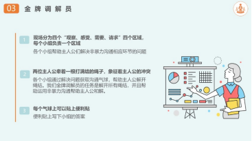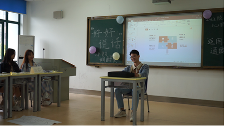 稍后,小财调解队向大家普及了非暴力沟通四步法——观察,感受,需求,请求。并带领大家运用非暴力沟通的方法缓解情景剧中静静和男朋友的冲突问题。该环节通过运用非暴力沟通的技巧,结合第三环节的情景剧,让同学们代入体验非暴力沟通的全过程。非暴力沟通知识填补了同学们对于沟通的认知空白,同时通过切身互动增加行为实践,强化认知。并且通过对非暴力沟通技巧的强化,完成建构主义的第二阶段的外界作用。让同学们体会和掌握非暴力沟通的技巧。