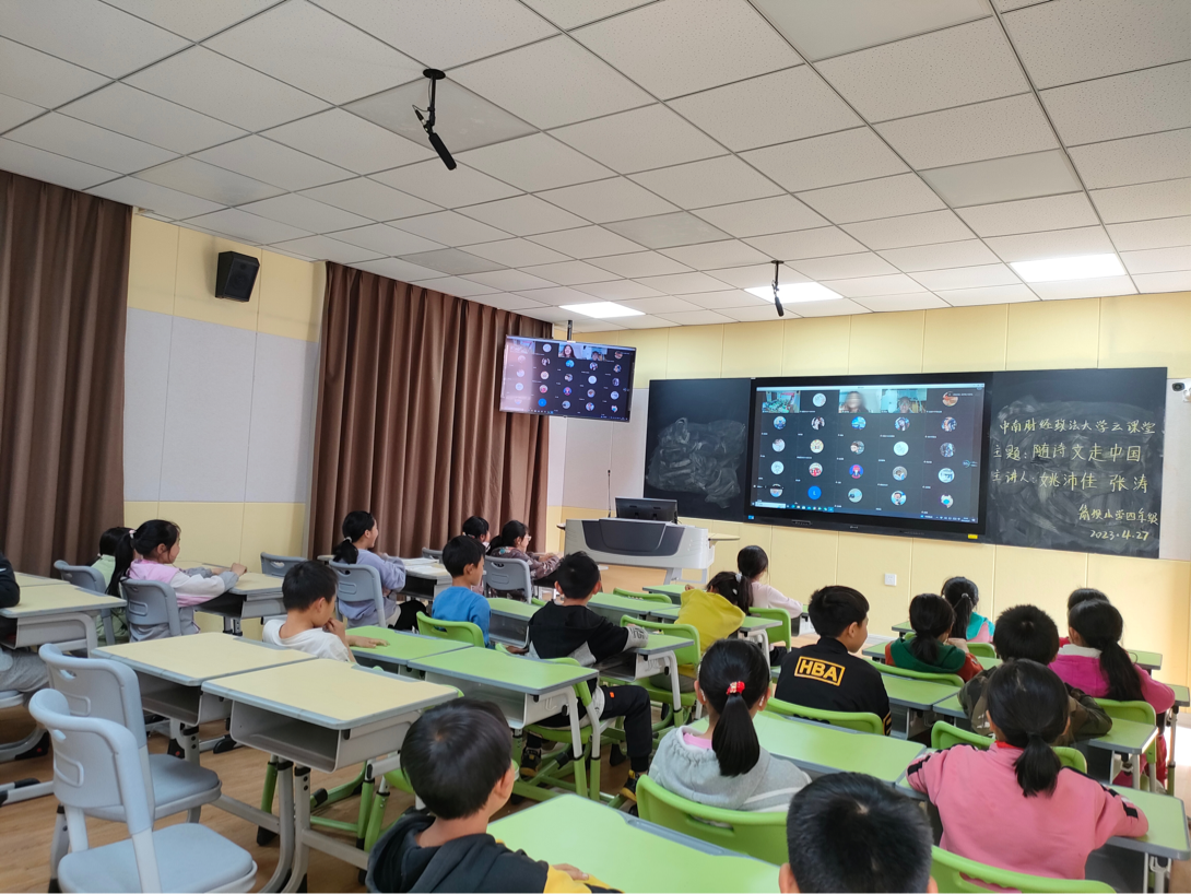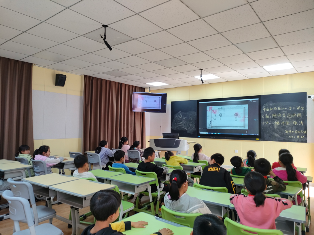 2023年4月27日下午,会计学院学生志愿服务团成员姚沛佳、张涛为云南省盐津县箭坝小学四年级同学开展了以“诗文里的中国”为主题的“云课堂”教学活动。课堂形式丰富,激发了同学们对诗文的兴趣。