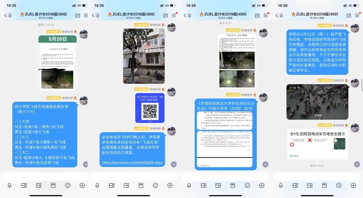 在自查伊始,学院从校园安全入手,利用新媒体平台大力宣传,不断强化同学们的安全意识。以电动车充电安全为主题,在学院团委公众号和2019级公众号发布推文3篇,利用各年级QQ群和微信群转发学校“飞线充电”整治自查工作通知和保卫部制作的相关视频,使同学们高度重视电动车充电安全。同时,学院制作了“关于飞线充电治理的调查问卷”,对全体本科生使用飞线充电情况进行了全面摸底。