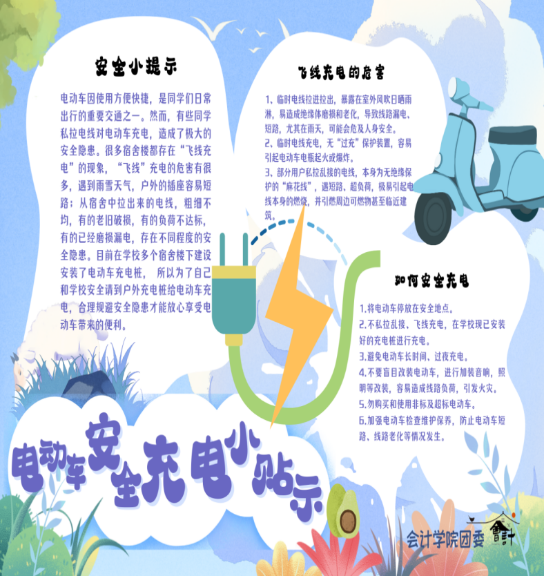 为进一步消除校园安全隐患,保障师生生命财产安全,根据学校通知要求和工作安排,会计学院学办开展了本科生“飞线充电”整治自查工作。整治重点为学院全体学生宿舍楼栋中电动自行车飞线充电、电动车电池带回宿舍充电,宿舍内使用明火、私拉乱接电线、使用大功率电器等违反消防安全管理规定的行为。