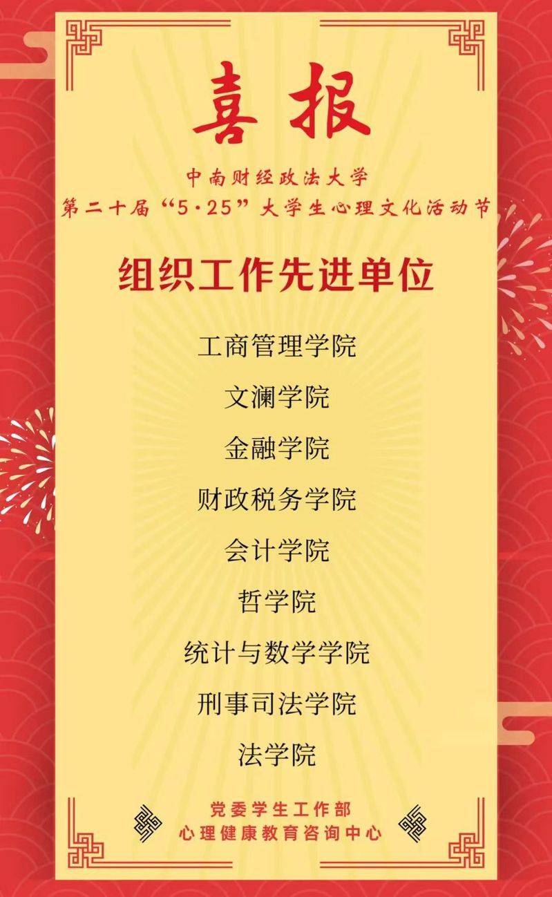 学院取得了学校第二十届“5·25”大学生心理文化活动节“组织先进单位”荣誉称号。2021级本科生丁诗怡、熊雨欣荣获学校第二十届“5·25”大学生心理文化活动节“优秀个人”荣誉称号。