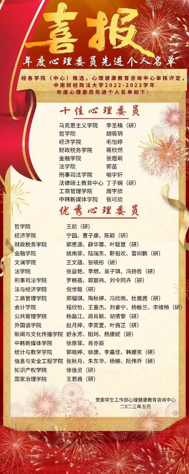会计学院财管2102班程欣怡、注会2103班王童杰、会计2204班刘睿宁、会计2207班杨敏兰和学硕2021级李维畅五位同学荣获学校第五届“心理委员先进个人”荣誉称号。