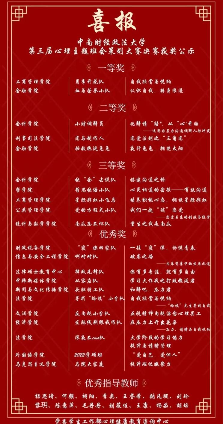 学硕2022级小财调解员队荣获学校第三届主题心理班会策划大赛二等奖,会计2204班快“会”去说队荣获学校第三届主题心理班会策划大赛三等奖,王誉希、黎玥两位老师荣获“优秀指导教师”荣誉称号。