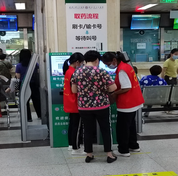 5月27日,会计学院志愿者协会白鸽服务队在湖北省人民医院主院区开展了“爱心助诊”志愿活动,为引导市民有序操作医院自动化设备,提高就诊效率贡献力量。(文/图 荣欣怡 白曼曼 邹海蕊 孙立淳 王怡宁)