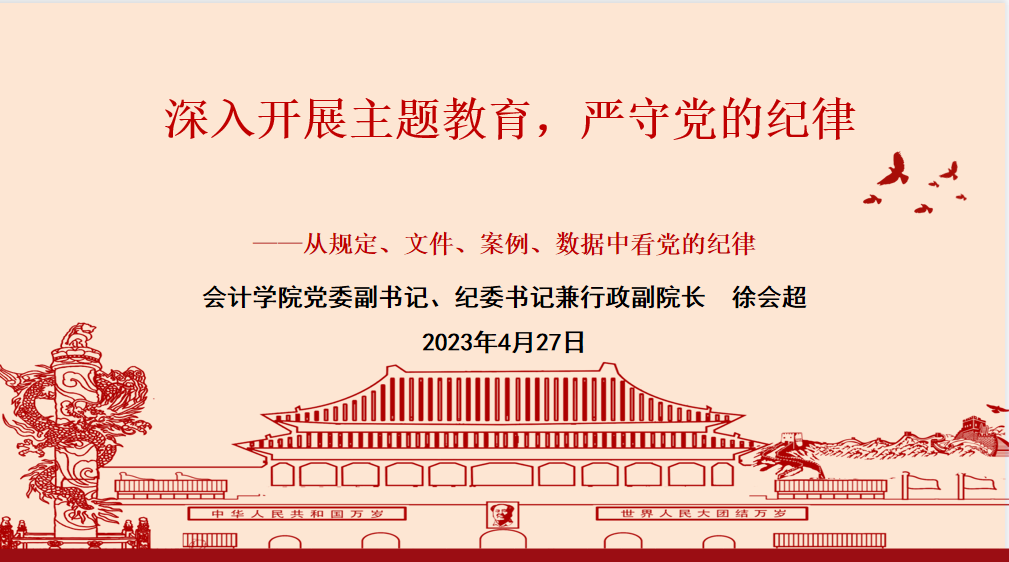 会计学院党委副书记、纪委书记兼行政副院长徐会超主讲“深入开展主题教育,严守党的纪律”专题党课。他从党的纪律建设的发展与分类、从案例与数据看党纪建设和新时代严守党的纪律的相关要求等三个方面开展讲解,通过相关案例分析介绍了严守党的纪律的重要性。他表示,要坚定全面从严治党,推动全党增强“四个意识”、坚定“四个自信”、做到“两个维护”,做一名守纪律讲规矩的合格党员。