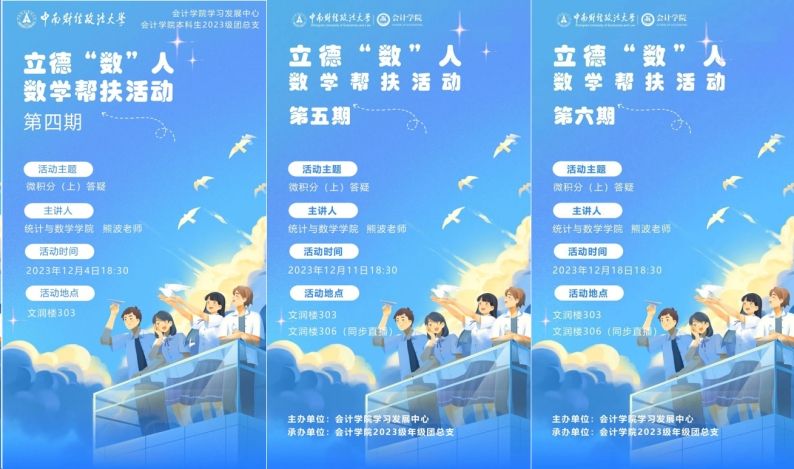 三期活动分别于12月4日、11日、18日晚在文润楼开展,特邀统计与数学学院熊波教授现场答疑。会计学院2023级辅导员陈楠、杨柳、徐乐到场协助。