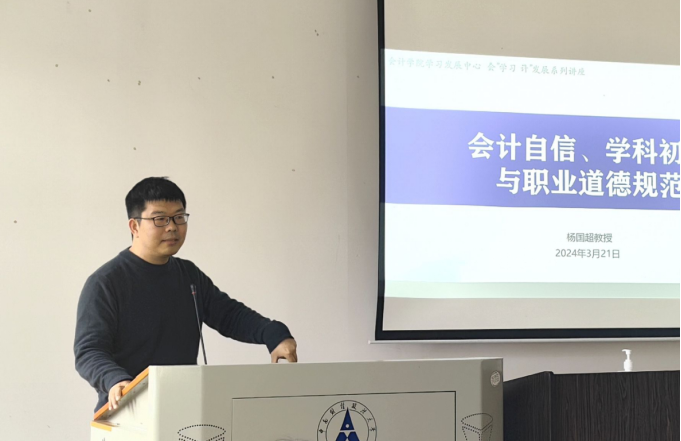 新闻网讯(学生通讯员 万雅馨 林家珍 明若钦 摄影 罗咏琳 许何则隆)为帮助同学们进一步理解会计学科,提升专业认知、明晰职业规划,3月21日下午,会计学院于文润楼303教室召开以“会计自信、学科初探与职业道德规范”为主题的专业认知讲座。本次讲座由会计学院杨国超教授主讲,会计学院辅导员杨柳主持,会计学院2023级本科生参与。