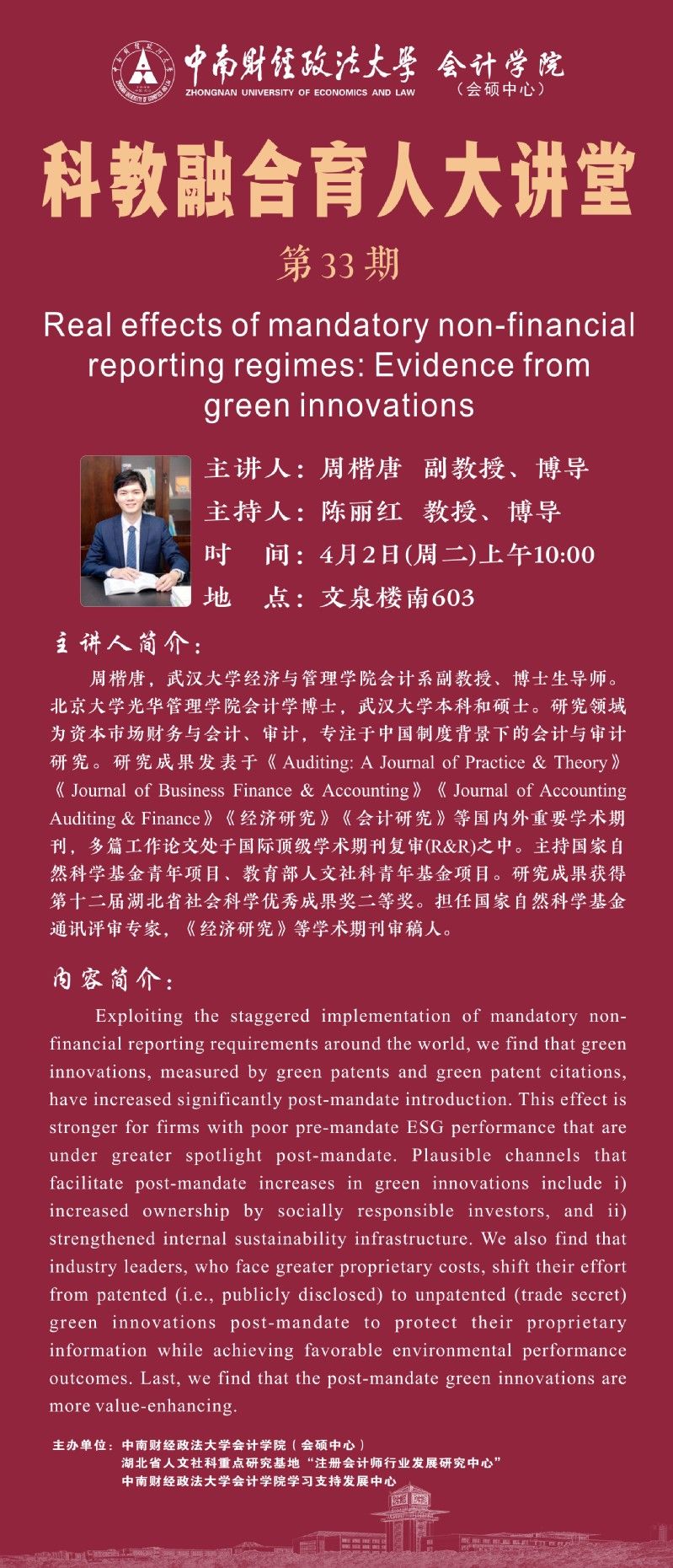 本次我们诚挚邀请武汉大学周楷唐副教授作为主讲嘉宾,为我们带来第33期科教融合育人大讲堂。