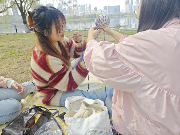 正值初春,沙湖一碧万顷,大家三三两两,自由踏青。春阳漫道,同学们或沿湖漫步,欣赏粼粼波光;或自由奔跑,“忙乘东风放纸鸢”;或在草坪上铺开毯子,享受悠闲的时光。同时,团支书陈胜楠准备了手工材料,供同学们制作精美实用的春日文创——艾草锤。身处环境优美的沙湖公园,同学们认识到了绿化工作所承载的重大意义,由此深入学习了习近平生态文明思想,领悟了“绿水青山就是金山银山”的深远含义。