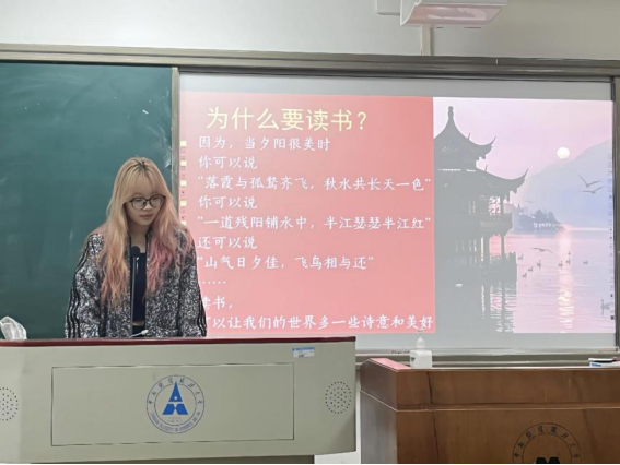 我们为什么要读书?陈柯屹以一张日暮湖景飞鸟图为媒介,启发同学们关于阅读的深刻思考。她提问道:“当你们看到这幅图时,会想到王勃的‘落霞与孤鹜齐飞,秋水共长天一色’,还是王维的‘山气日夕佳,飞鸟相与还’呢?”陈柯屹巧妙地向同学们了展示阅读的重要性。正如古人所言:“胸藏文墨怀若谷,腹有诗书气自华。”通过阅读,我们能够积累深厚的文化底蕴,展现出独特的个人魅力。