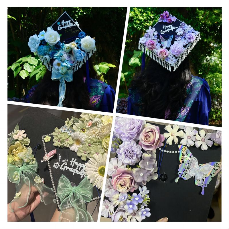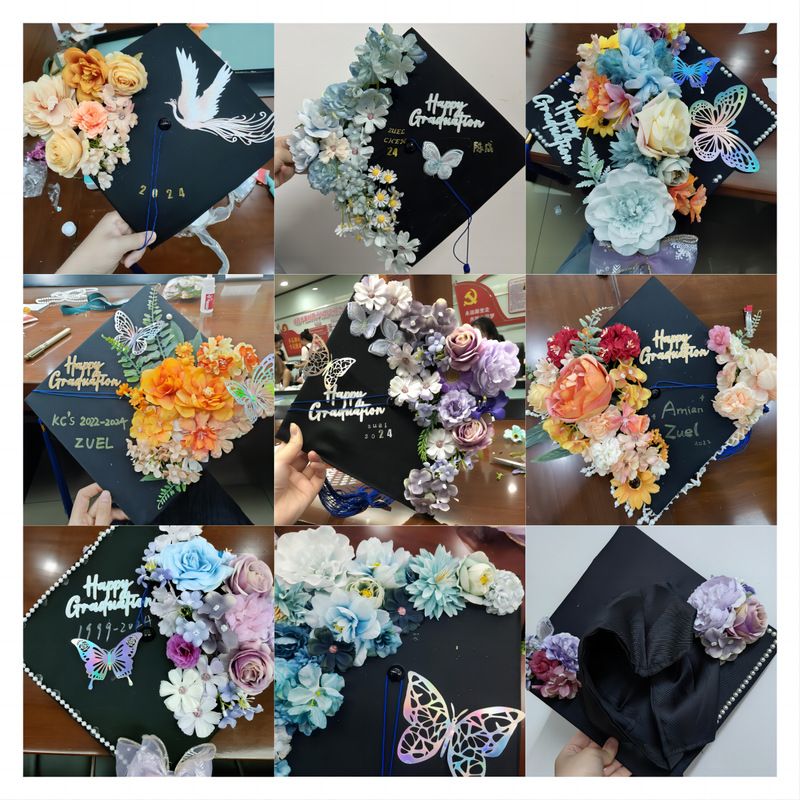 活动以集中和分散相结合的方式开展,共计80名同学报名参与。活动中,同学们用颜色各异的绢花,缀以叶子、珠串、丝带等元素制作了属于自己独一无二的硕士学位帽,留下了浪漫美好的毕业回忆。(文/杭慧喆)