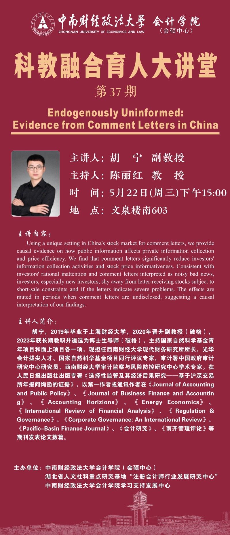 本次我们诚挚邀请西南财经大学胡宁副教授作为主讲嘉宾,为我们带来第37期科教融合育人大讲堂。