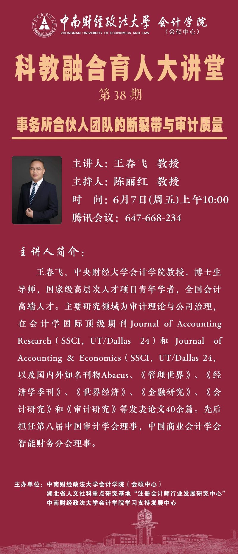 本次我们诚挚邀请中央财经大学会计学院王春飞教授作为主讲嘉宾,为我们带来第38期科教融合育人大讲堂。