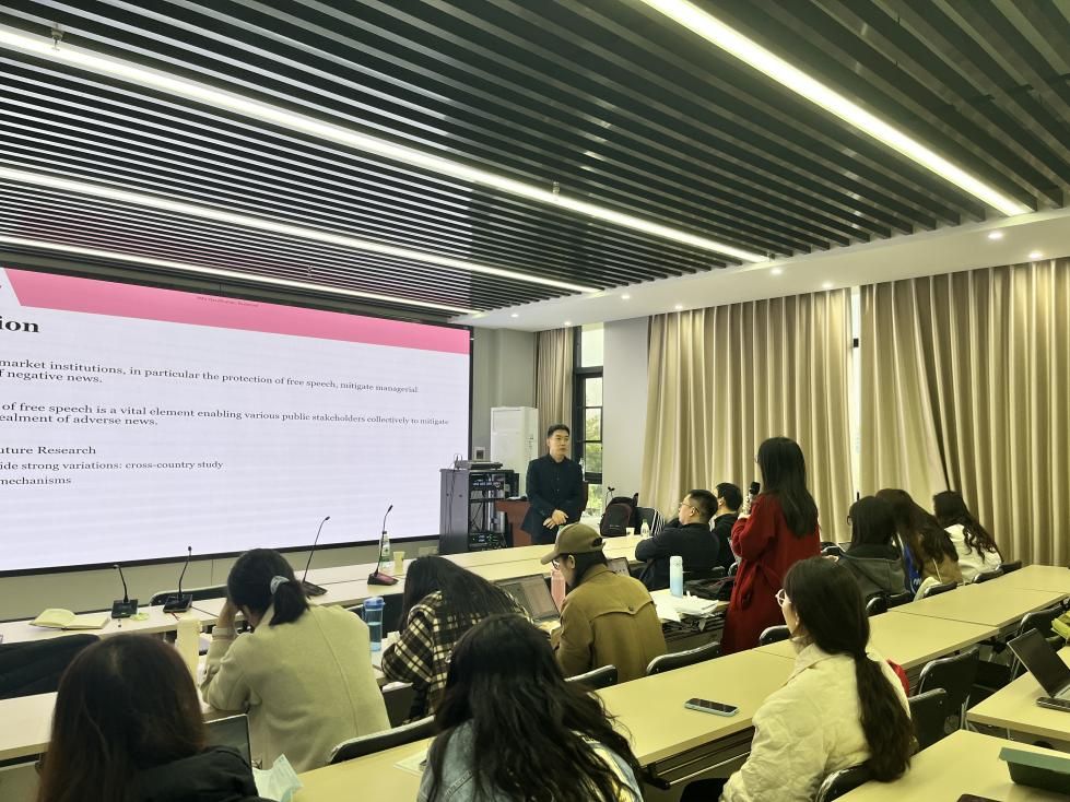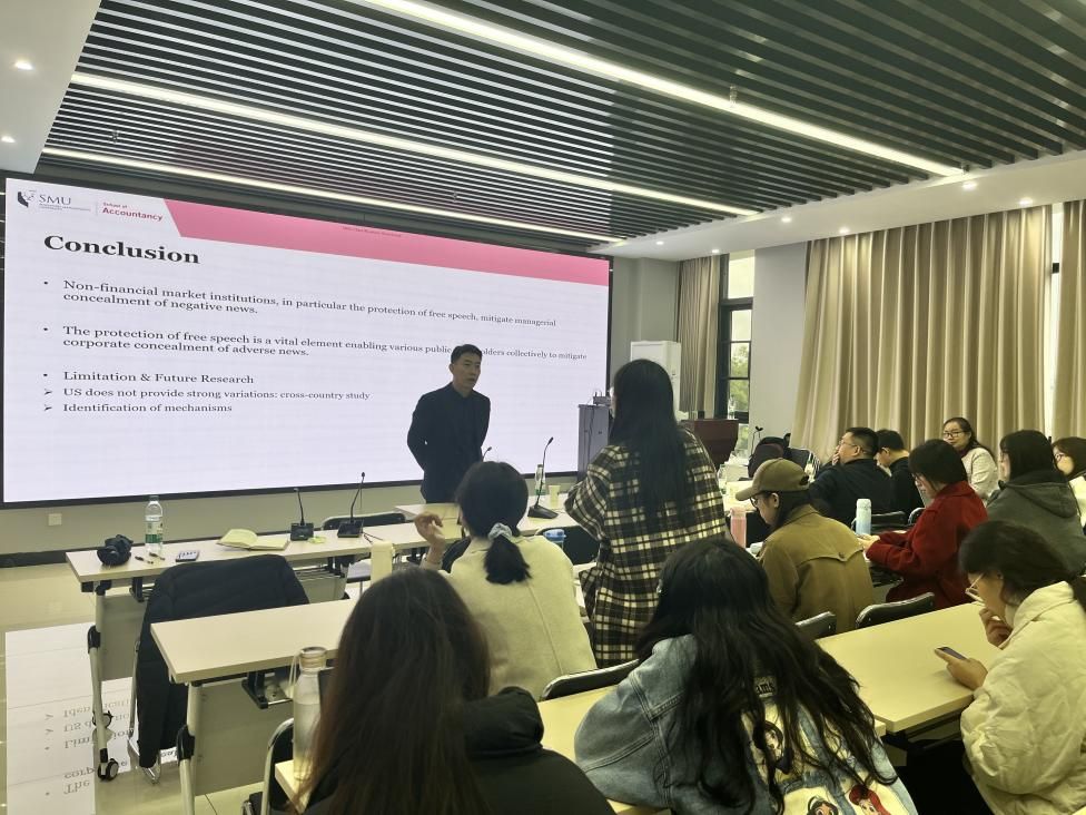 2024年11月25日星期一上午10:00——12:00,会计学院第160次“中南·会计Seminar”学术讲座在文瀚楼北406顺利举行。本次学术讲座由黄勇副教授主持,邀请到了张连栋教授进行了题为《Freedom of Expression Protection and Corporate Concealment of Bad News: Evidence from State Anti-SLAPP Laws》的研究分享。张连栋教授为新加坡管理大学会计学教授、会计学院副院长,其研究方向主要包括公司财务报告、信息披露、公司治理和税收。