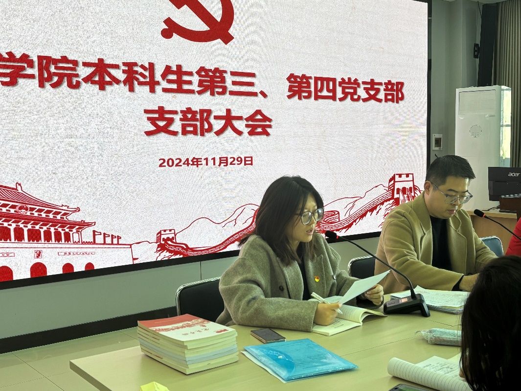 同日,本科生第三、第四党支部召开了支部大会,讨论关于接收吴江波等3名同志为中共预备党员的相关事项。支部大会由胡牧孜老师主持。3名发展对象逐一宣读《入党志愿书》,汇报对党的认识、入党动机、现实表现等情况。范纯琍、王梦瑶同志分别向支部大会汇报党员发展对象的培养教育考察情况、政审情况以及支委会意见。本科生第三、第四党支部党员大会通过无记名投票方式进行了表决。最终,经支部大会充分讨论,同意接受吴江波等3名同志为中共预备党员。