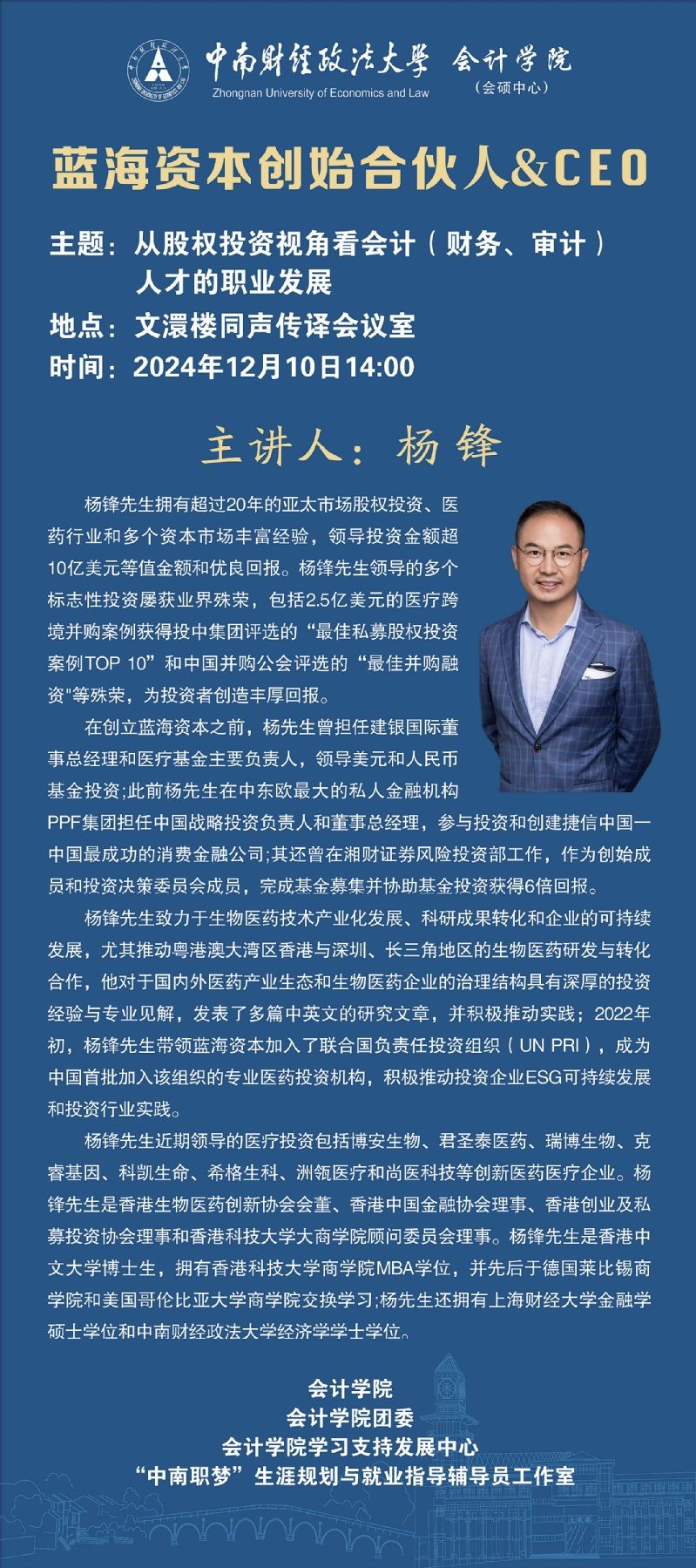学术讲座 | 从股权投资视角看会计(财务、审计)人才的职业发展