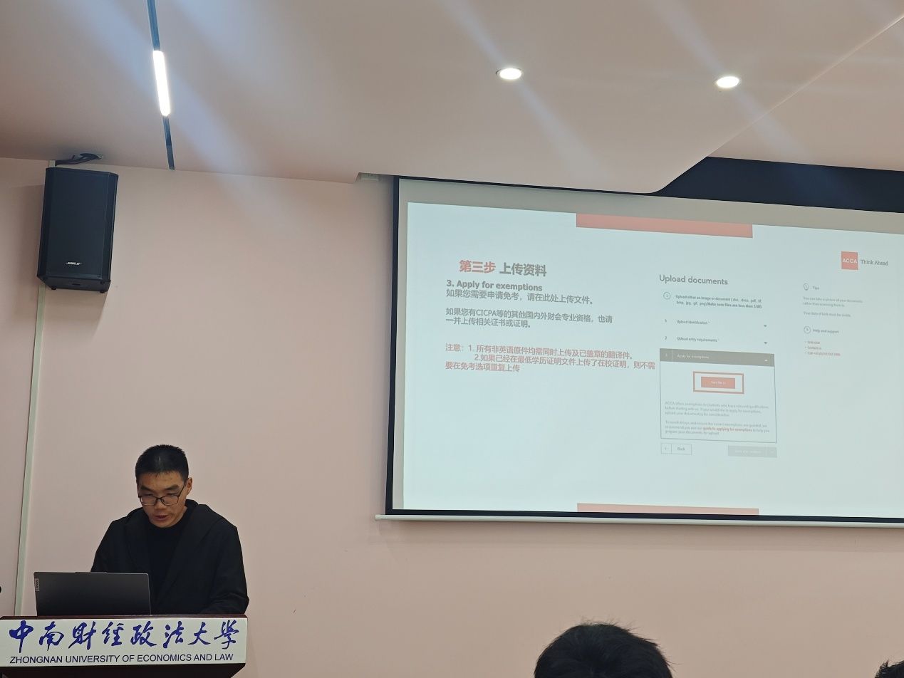 会上,主讲人韩均杰详细讲解了ACCA注册流程。韩均杰还特别提醒同学们,注册时姓名、出生日期等信息要与身份证明文件一致,文件上传需符合规范,支付时建议使用电脑操作并关注汇率变动。同时,针对注册过程中常见问题,如缺文件原件与翻译件、材料未加盖公章等,也给出了具体解决办法。