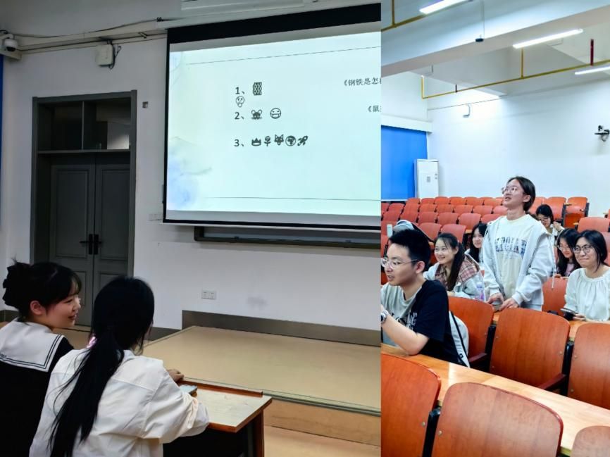 随后,活动进入互动环节。首先进行的是“emoji猜书名”小游戏,同学们分成小组,认真讨论,积极竞答。施嘉怡同学表现出色,连续答对3题,成为本轮游戏的佼佼者,陈凌欣等同学也积极参与其中,现场欢声笑语不断。