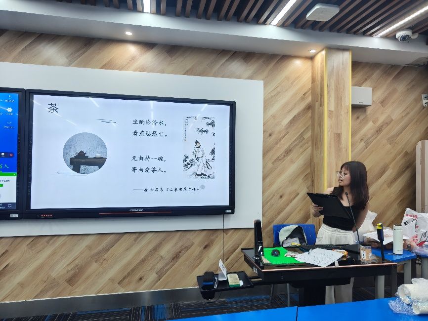 进入茶文化诗词欣赏环节,团支书陈胜楠以“晴窗细乳戏分茶”“且将新火试新茶”等诗句为引,讲述茶在传统文化中的意蕴。同学们在袅袅茶香中诵读经典,感受诗与茶交融的雅致,也为接下来的DIY环节铺垫灵感。