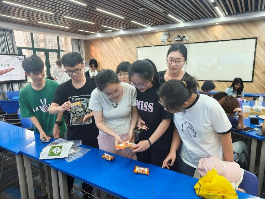 活动伊始,29包贴有不同诗句的小零食成为破冰关键。同学们需根据包装上的诗词线索寻找“队友”。如“且将新火试新茶,诗酒趁年华”对应宋代,“临湖门外吴侬家,郎若闲时来吃茶”对应元代,还有分别对应唐、明、清、近现代的诗句,对应各个组别。在欢声笑语中,六组队伍迅速集结,两组合并为一大组围坐桌前,正式开启后续环节。