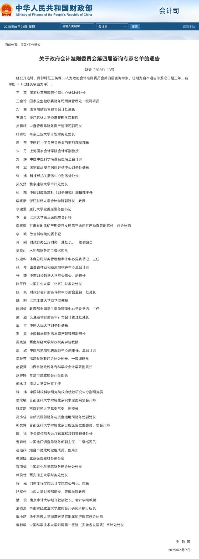 2025年6月20日,财政部发布《关于政府会计准则委员会第四届咨询专家名单的通告》(财会〔2025〕13号),米兰电竞·(中国区)党委常委、副校长、会计学院院长张琦教授、政府会计研究所执行所长潘晓波副教授入选,任期三年。目前,政府会计研究所专职研究员已有3人入选过政府会计准则委员会咨询专家,张琦教授入选第一、二、三、四届咨询专家,王芳教授入选第一届咨询专家,潘晓波副教授入选第二、三、四届咨询专家。