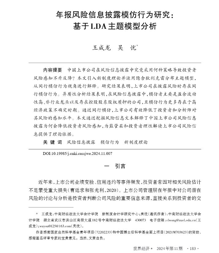 论文题目:年报风险信息披露模仿行为研究:基于LDA主题模型分析