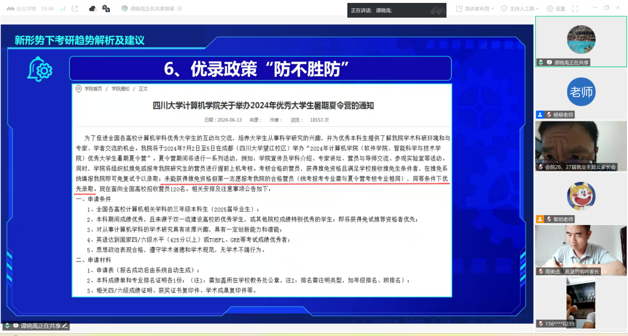 为深化家校协同育人,助力2026届、2027届本科毕业生明确职业规划方向、提升就业升学竞争力,7月2日19点,会计学院组织召开“2026届、2027届毕业生云家长会暨就业交流会”。2022级年级主任、辅导员黎玥,2023级年级主任、辅导员杨柳,学生家长及百余名学生“云端”相聚,共话学生成长与未来发展。