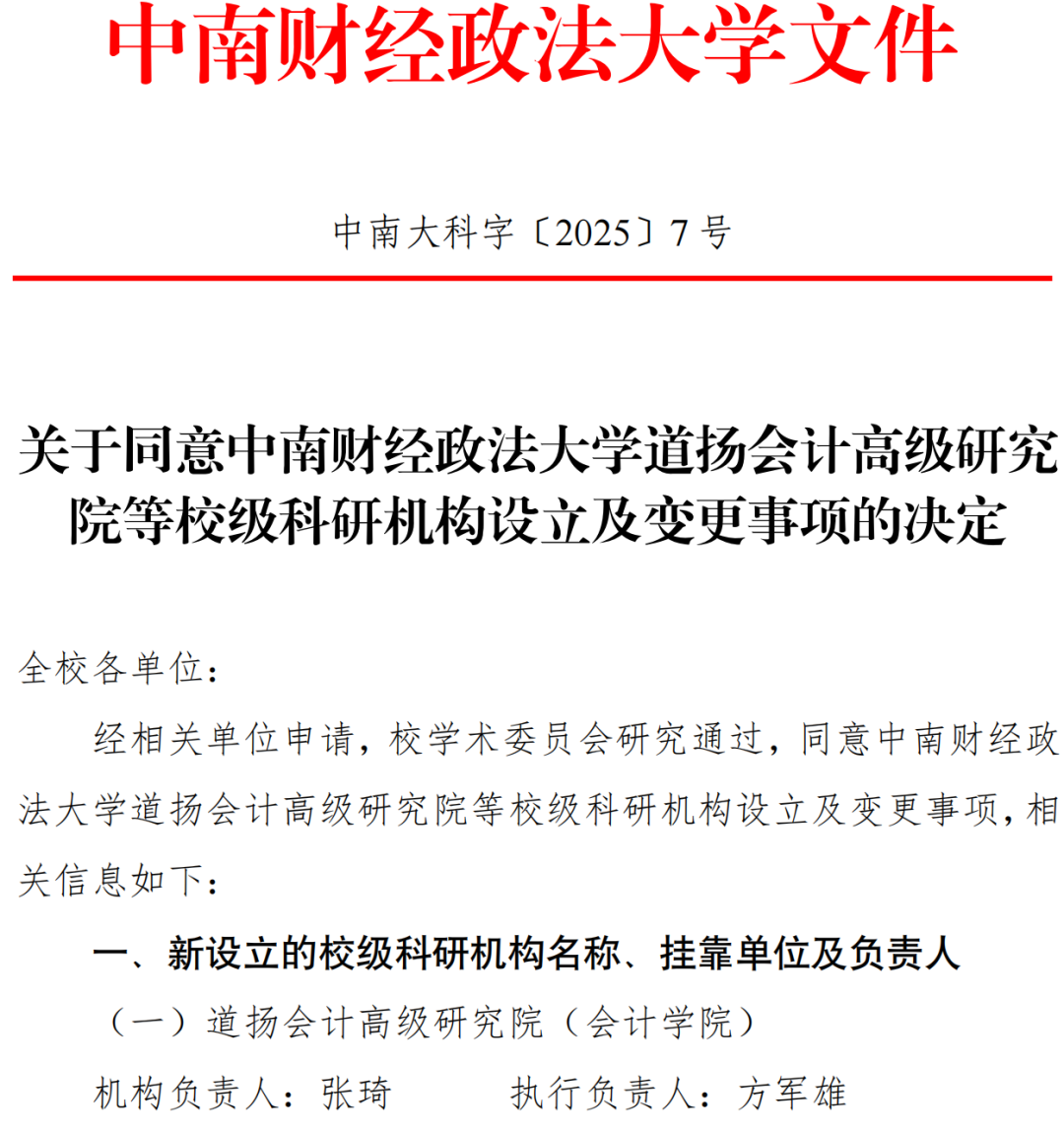 成立道扬会计高级研究院,校党委常委、副校长、会计学院院长、国家级青年人才张琦教授担任研究院院长,引进国家级青年人才方军雄教授担任执行院长。研究院取 “道扬” 二字,既表达了对以郭道扬教授为代表的中南大老一辈会计人的崇高敬意,旨在传承其深厚的学术品质与思想;又展示了新一代中南大会计人敢于创新的勇气,肩负起传播新时代会计思想的使命担当。研究院秉持“开放式、高标准”定位,着力打造顶尖成果培育高地,全力冲击高水平标志性学术成果。