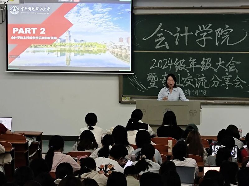 为帮助2024级本科生了解专业分流政策,合理规划学业发展,明确目标、提升自我,2025年9月19日,年级于文波楼303、305教室召开年级大会暨专业分流分享会。会计系主任柳光强、审计系主任张胜、财务系副主任赵纯祥、本科教学管理办公室江俐、辅导员孙紫微和全体2024级本科生参与此次会议。