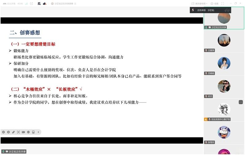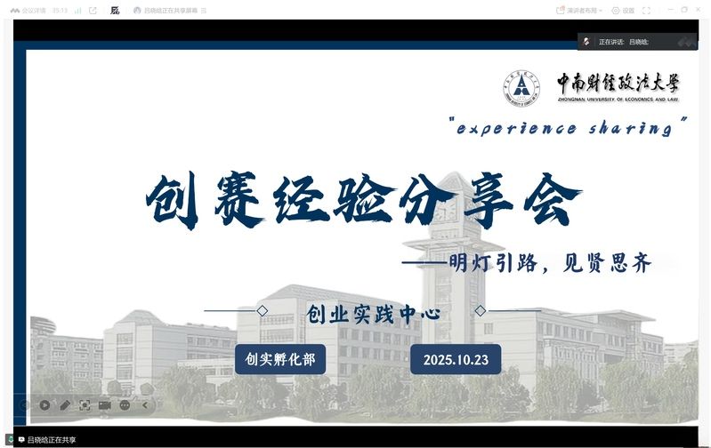 为助力学子深度洞悉创业赛事内核、全面提升参赛素养,2025年10月23日,会计学院创业实践中心项目孵化部倾心打造的“明灯引路,见贤思齐” 创新创业竞赛经验分享会于线上顺利召开。本次分享会特邀创赛履历斐然的沙芷名师姐、林涵师姐担任主讲嘉宾,为全院学子构建起一个学创赛知识、悟创赛精髓、共话成长的交流平台,有力推动了学院创新创业教育工作的正向发展。