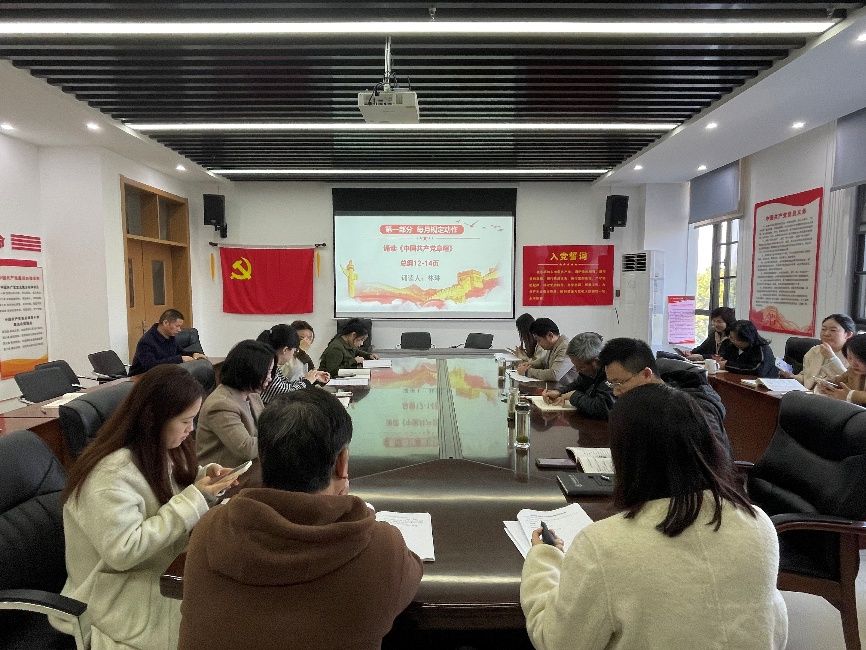 活动伊始,全体党员现场交纳党费,面向党旗重温入党誓词,铿锵有力的誓言回荡在会场,进一步坚定了党员们的理想信念与初心使命。随后,林琳同志带领大家诵读《中国共产党章程》总纲第12-14页,通过逐字逐句研读,让党员们再次深化对党的性质、宗旨和奋斗目标的认识,强化党员意识和责任担当。