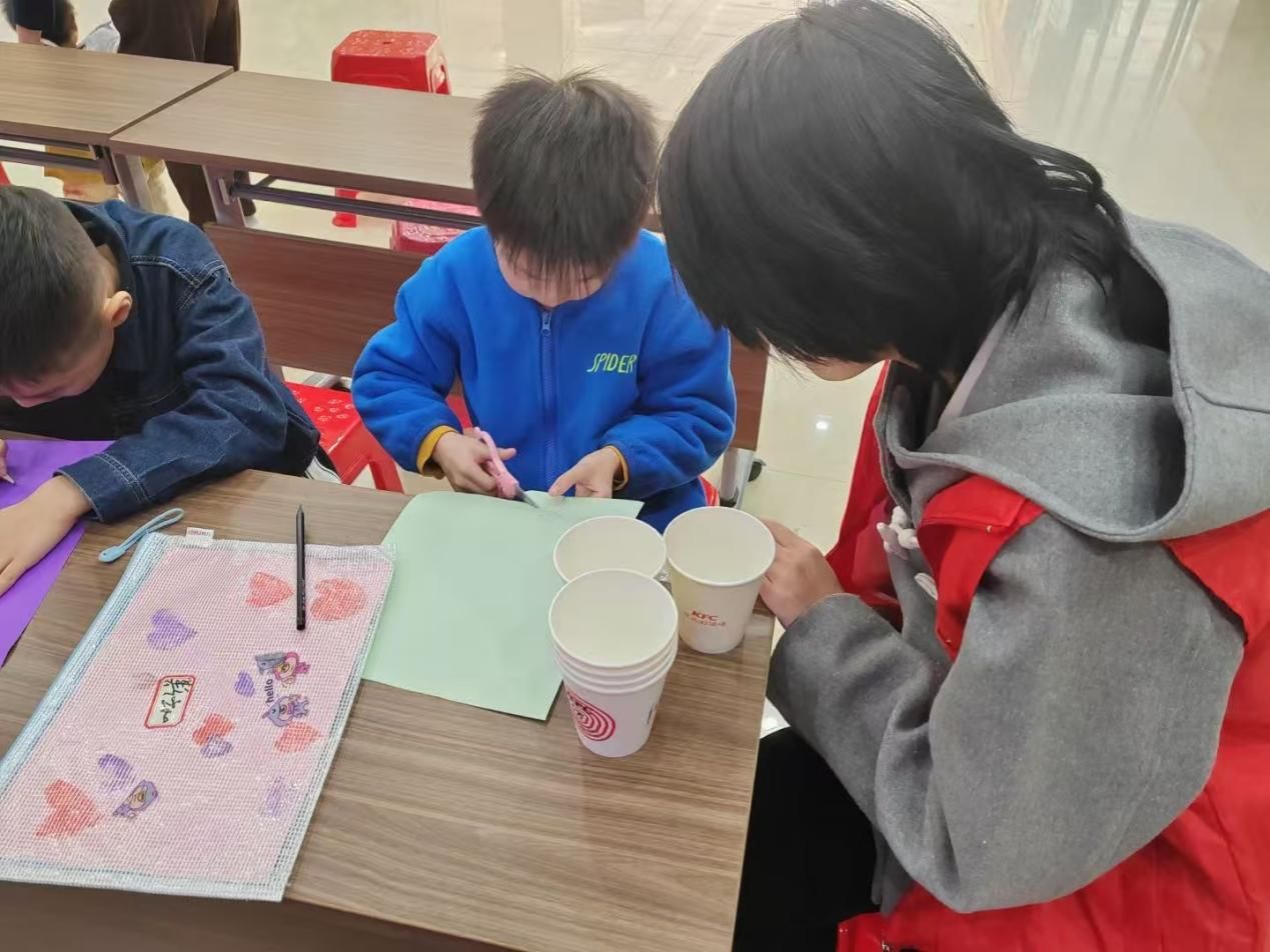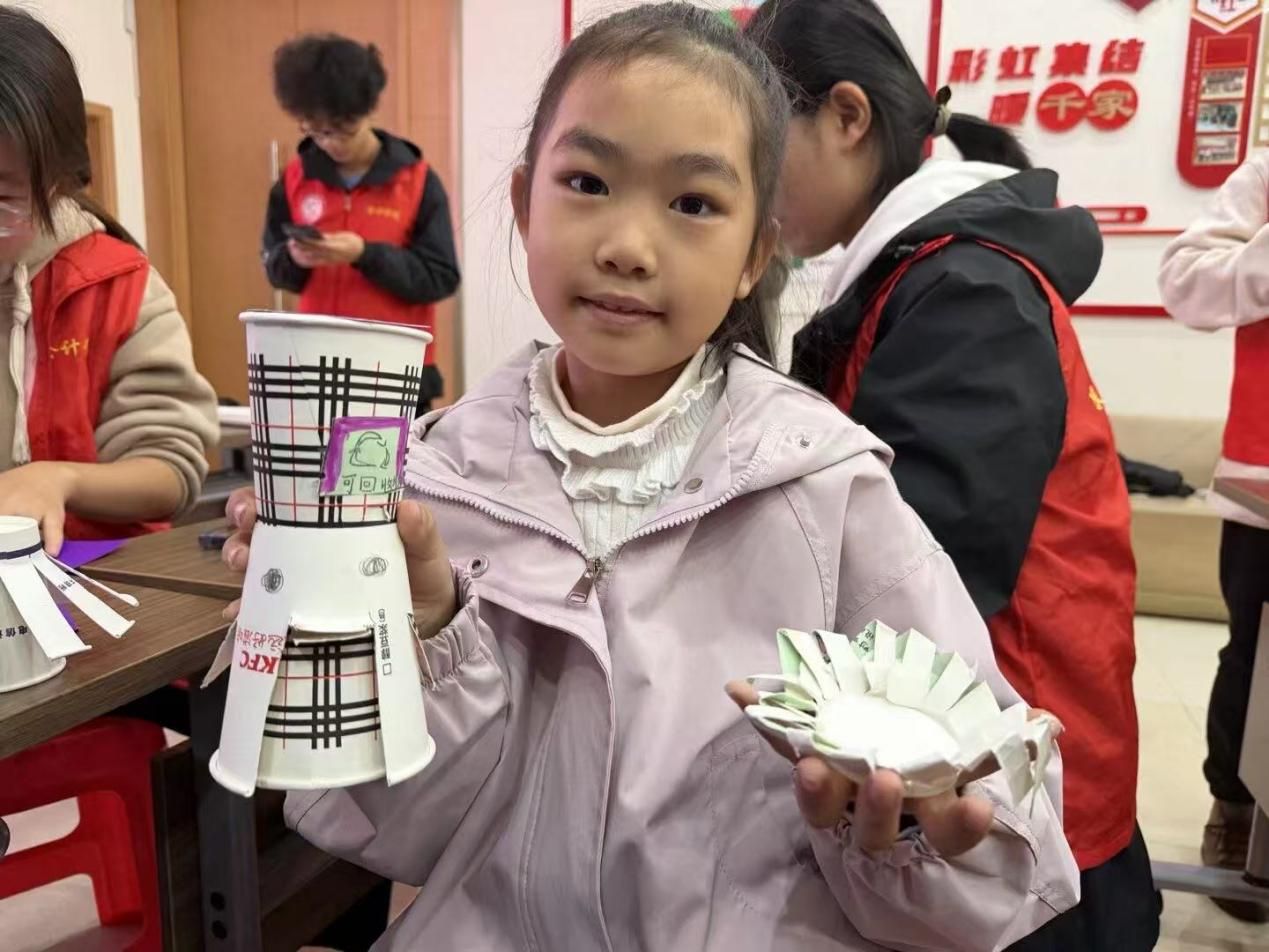 实践过程中,志愿者始终耐心陪伴:看到有孩子纠结“耳朵粘在哪里更可爱”,志愿者会蹲下身一起讨论;遇到孩子担心胶水粘到手,志愿者会示范“少量多次涂胶水”的技巧,并提醒“胶水用完要盖紧盖子,下次还能接着用,不浪费”;发现有孩子把剪下来的碎纸随手放在桌上,志愿者会 递上小袋子说:“这些碎彩纸也是可回收的,我们把它收好,活动结束后一起分类处理。”一个小时里,原本普通的纸杯在孩子们的手中不断“变身”,成为一件件充满童趣的手作,孩子们的脸上满是专注与自豪,时不时还会互相展示自己的成果,分享创作思路。