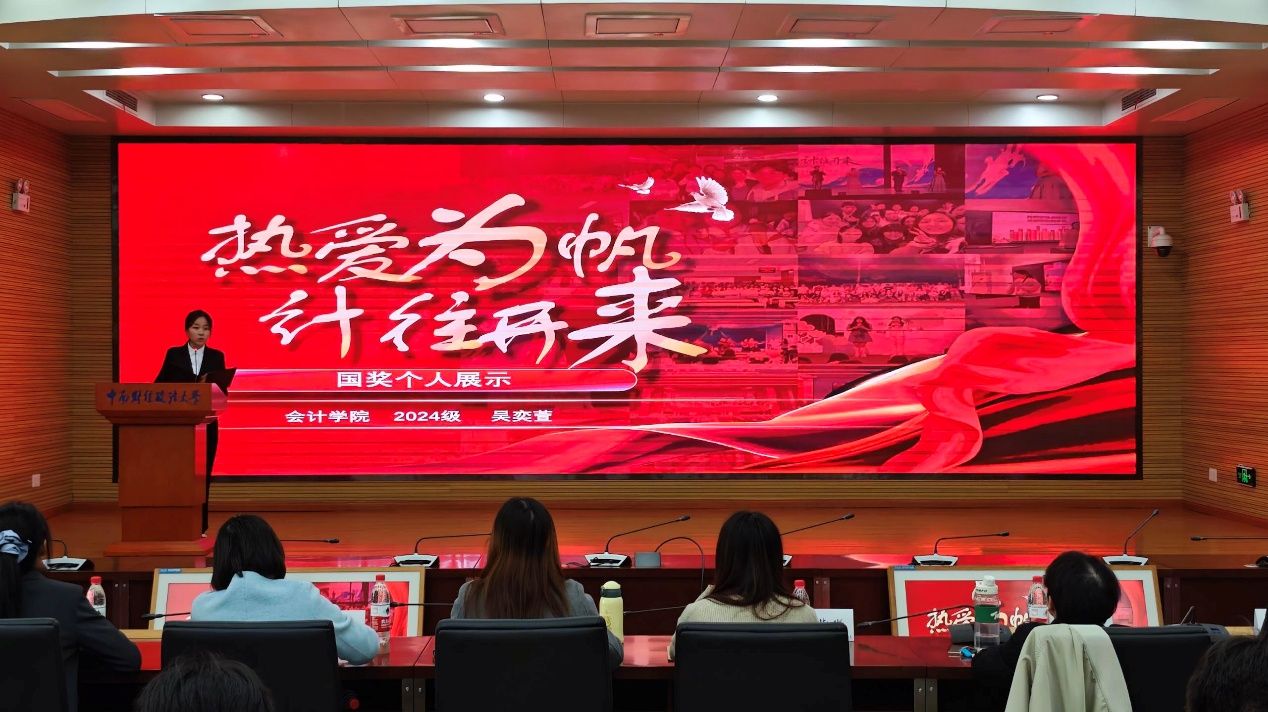 国奖获得者会计2302班刘佳莹以《晨光中耕耘,知行间求索》为主题,分享了自己“博观微取、厚积薄发”的心得。“我的大学故事,始于每一个于晨光里踏出宿舍楼,迎接朝阳与新鲜空气的平凡清晨,归于‘精业笃行,耕而不辍’的坚持。”她以“日拱一卒,功不唐捐”的努力精进学业,“广泛涉猎,锐意进取”的态度挑战科研,积极在学业上帮扶朋辈,书写互助共进、向阳而生的青春。