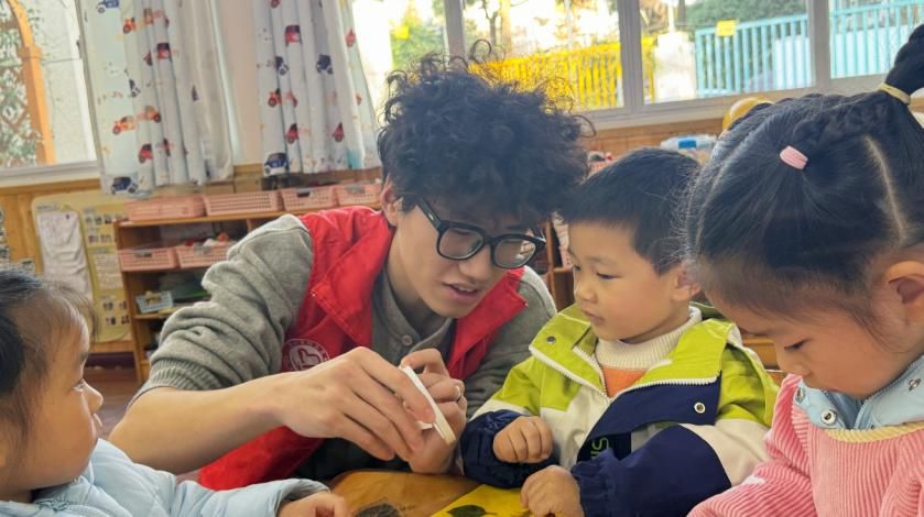 动手创作环节将活动推向了高潮。志愿者们分组陪伴在孩子们身边,耐心指导他们进行树叶拼贴。小朋友们仔细挑选着心仪的叶片,小心翼翼地将它们粘贴在卡纸上。有的把火红的枫叶做成蝴蝶翅膀,有的用金黄的银杏叶拼出蝴蝶身体,还有的别出心裁地用不同颜色的树叶搭配出独特的图案。创作过程中,志愿者们不时俯身指导,教室里洋溢着欢声笑语。