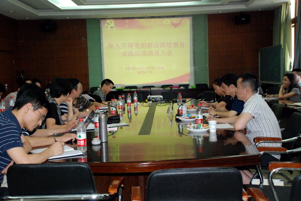 2013年7月11日下午,会计学院在文泉楼南楼四楼会议室召开党的群众路线教育实践活动动员大会。学校第一督导组组长王贞为、副组长汪瑛、工作人员苏平出席大会,全体院领导,各教工党支部书记,院学术委员会主席,系(中心)正副主任,教研室正副主任,国际会计教育中心项目主任,党政办公室全体工作人员,学生工作办公室、研究生办公室、MPACC中心办公室、团委负责人以及学生代表参加了动员会。大会由院党委副书记王延主持。