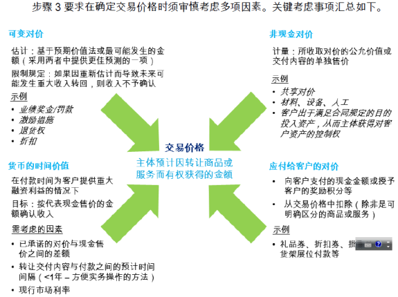 (3)交易价格的确定:可变对价、合同中的重大融资成分、非现金对价、应付客户对价、货币时间价值等;