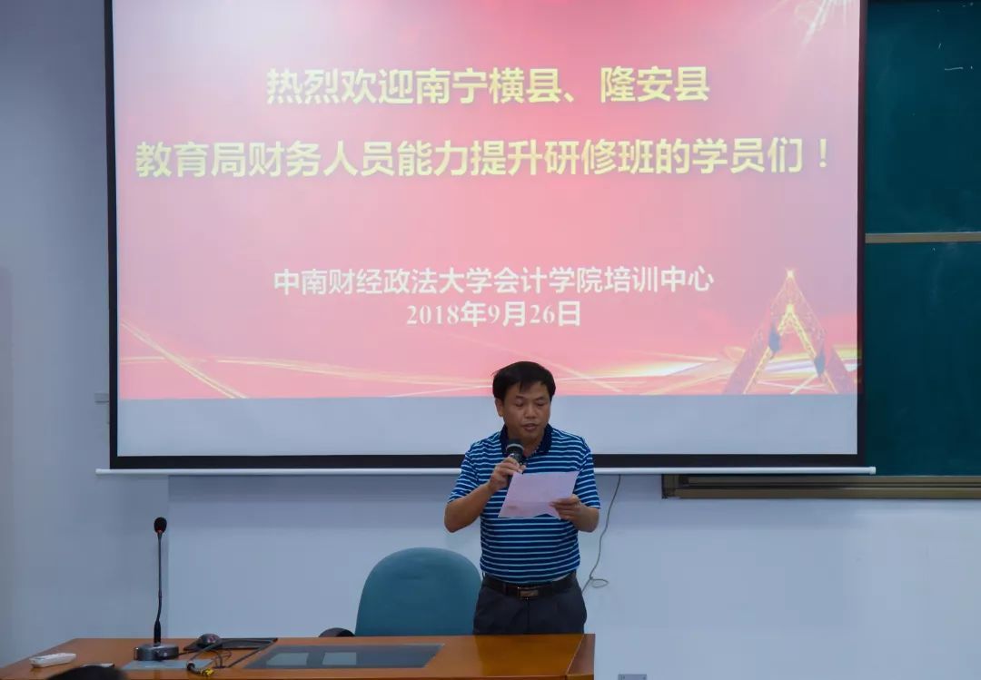 2018年9月25日至9月29日,南宁横县、隆安县教育局携手我院培训中心举办财务人员能力提升研修班。本次研修班通过课程讲授、案例讨论等活动,旨在帮助高校财务人员进一步了解我国会计改革与发展的新动态,准确把握现行政府会计制度、政府会计准则,进一步提高参会人员的政策水平、业务技能和综合素质。