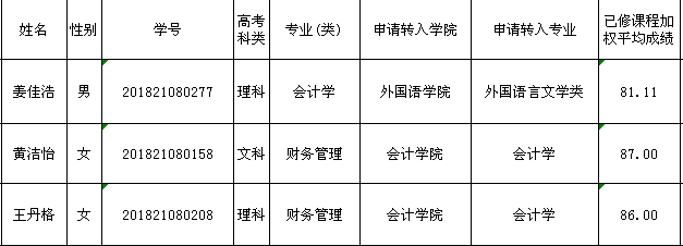 根据《米兰电竞·(中国区)本科生调整修读专业管理办法(修订)》(中南大教字[2017]17号)文件精神和《关于做好2018级普通本科学生调整修读专业(类)工作的通知》的要求,经审核,我院下面三位学生符合申请调整修读专业的要求,予以公示。公示时间为2019年3月5日-6日。如有异议,请于2019年3月6日17:00点前将书面申请交到会计学院教学办(文泉楼南307)。