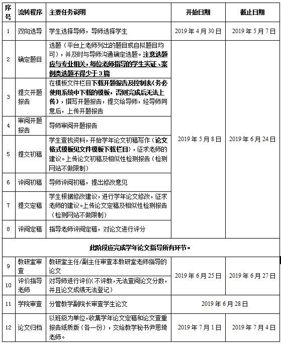 学院已在论文系统中设置各阶段的时间节点(如下表),请指导教师和学生严格遵照相关的时间要求,如学生提交论文资料逾期一次,学年论文成绩建议指导老师扣减5分。