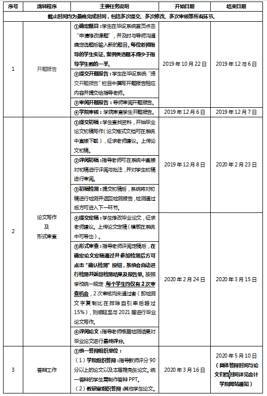 学院根据学校统一布置与要求,已在论文系统中设置各阶段的时间节点(如下表),请指导教师和学生严格遵照相关的时间要求进行,到期将关闭论文系统。