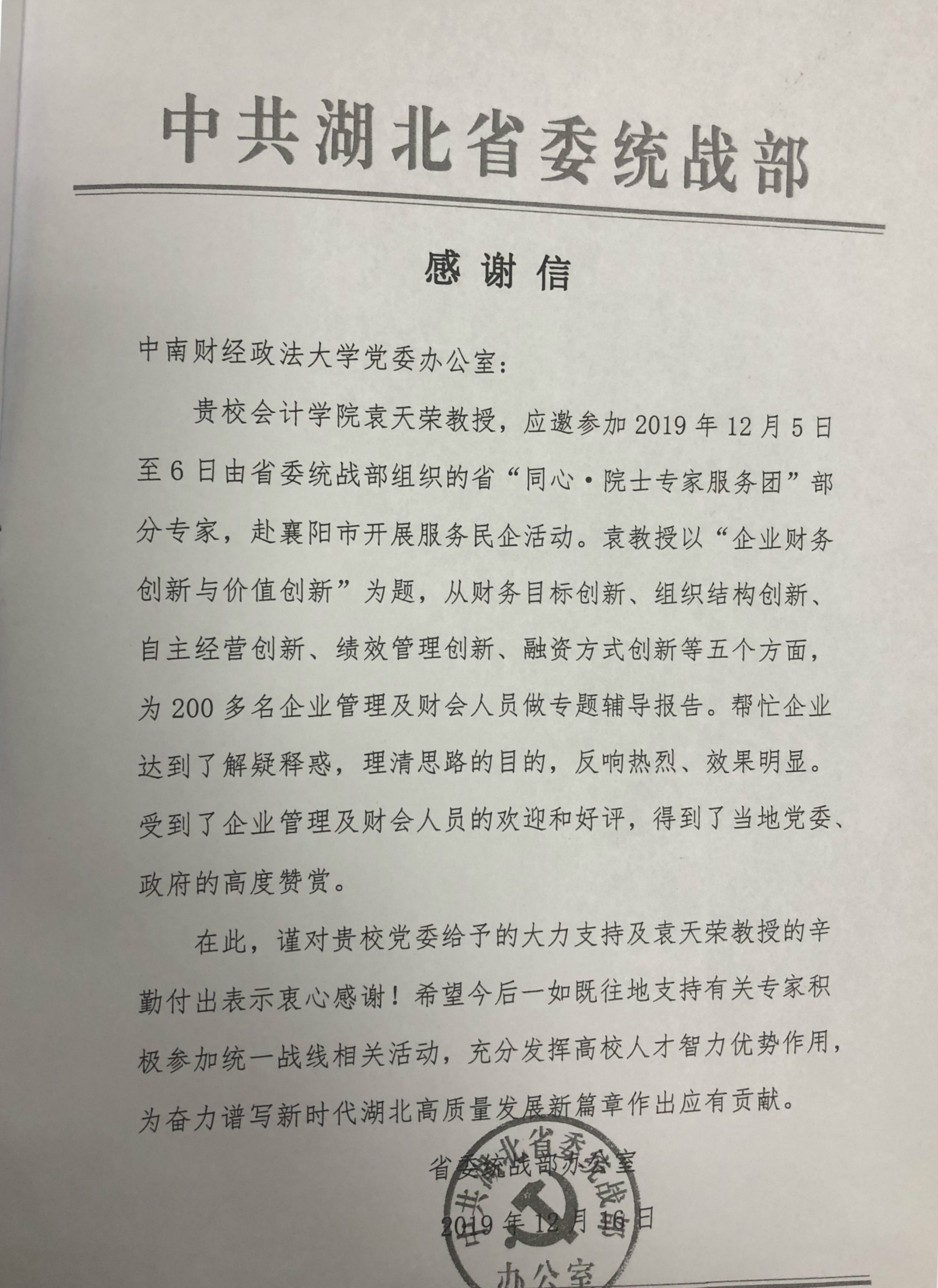 •     (通讯员 徐会超 曹运波20191216,学校收到中共湖北省委统战部感谢信,对我院袁天荣教授参加省委统战部组织的省“同心·院士服务团”服务民企活动表示感谢。这既是对我校、我院统战工作的肯定和鼓励,也是多年来我院各民主党派积极履行参政议政职能的缩影和佐证。