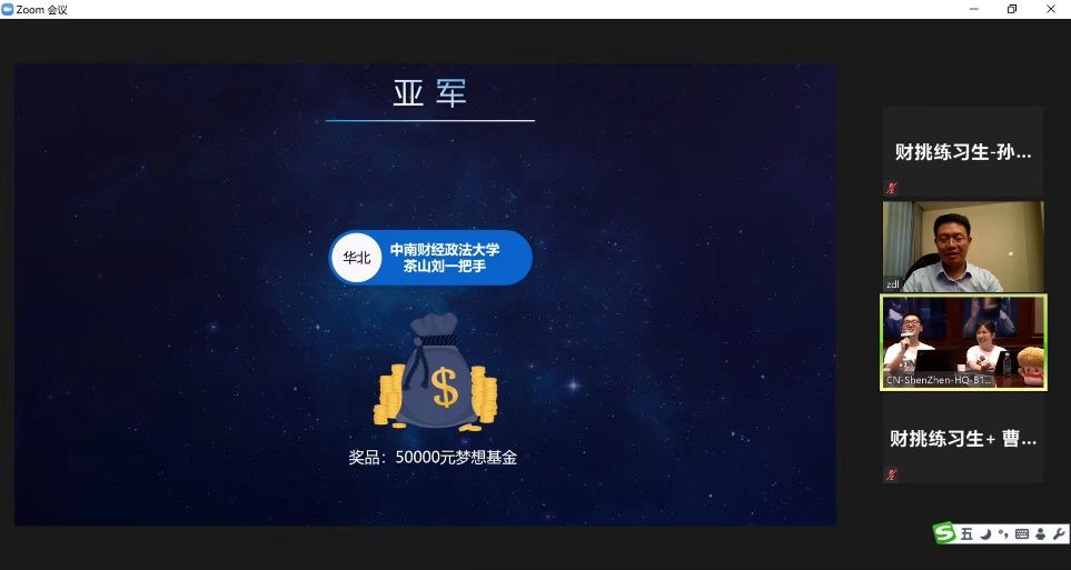 (通讯员:王嘉鑫、曾欣昀)2020年6月20日上午8点半至下午6点,第十届华为财务精英挑战赛全球总决赛在线上zoom会议室举行,会计学院队伍代表学校参赛。在张敦力院长等院领导和学院相关教工的全力支持下,由队伍指导老师王嘉鑫带队,从全球12761名选手中脱颖而出,一路奋战,最终荣获全球总决赛亚军。张敦力院长作为高校评审团队专家出席了本次比赛,并对选手们的表现进行专业点评。我校代表队成员有注会1801汤凯琳,会基1801徐嘉逸,金数1802曾欣昀,信管1801石锴文以及18级研究生刘震。