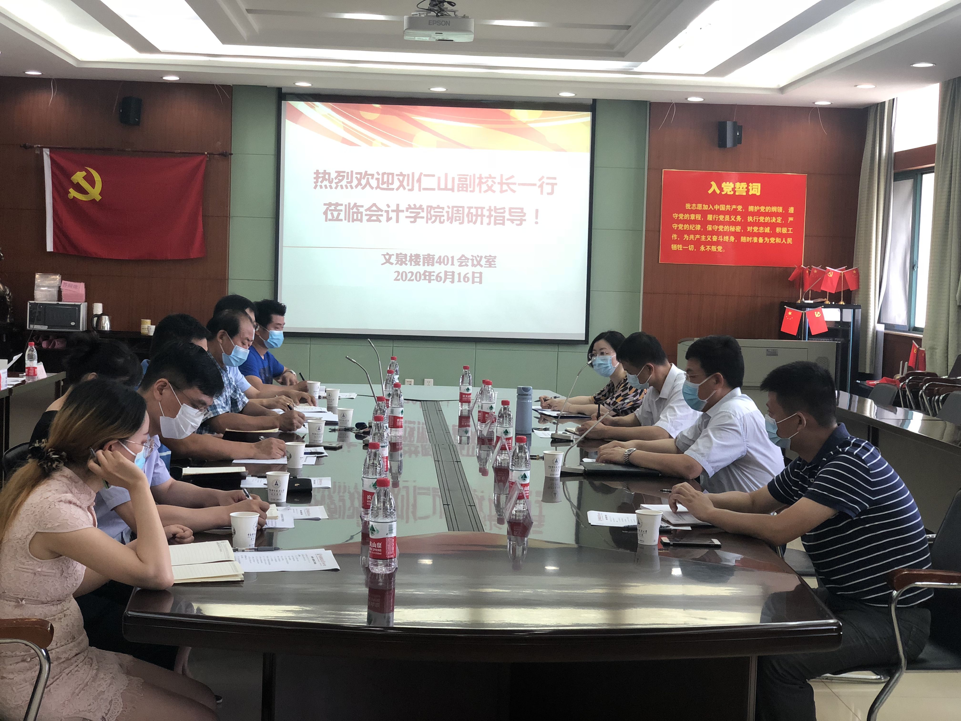 (通讯员:畅雅莉) 2020年6月16日上午,校党委常委、副校长刘仁山,继续教育学院院长刘建明,教务部副部长伍施乐,党委办公室、学校办公室副主任黄波一行来到会计学院,调研会计学院本科教学和继续教育工作。会计学院院长张敦力、党委书记殷修林、党委副书记王延、副院长王华、党委副书记兼行政副院长徐会超及相关工作人员参会。调研会由张敦力主持。