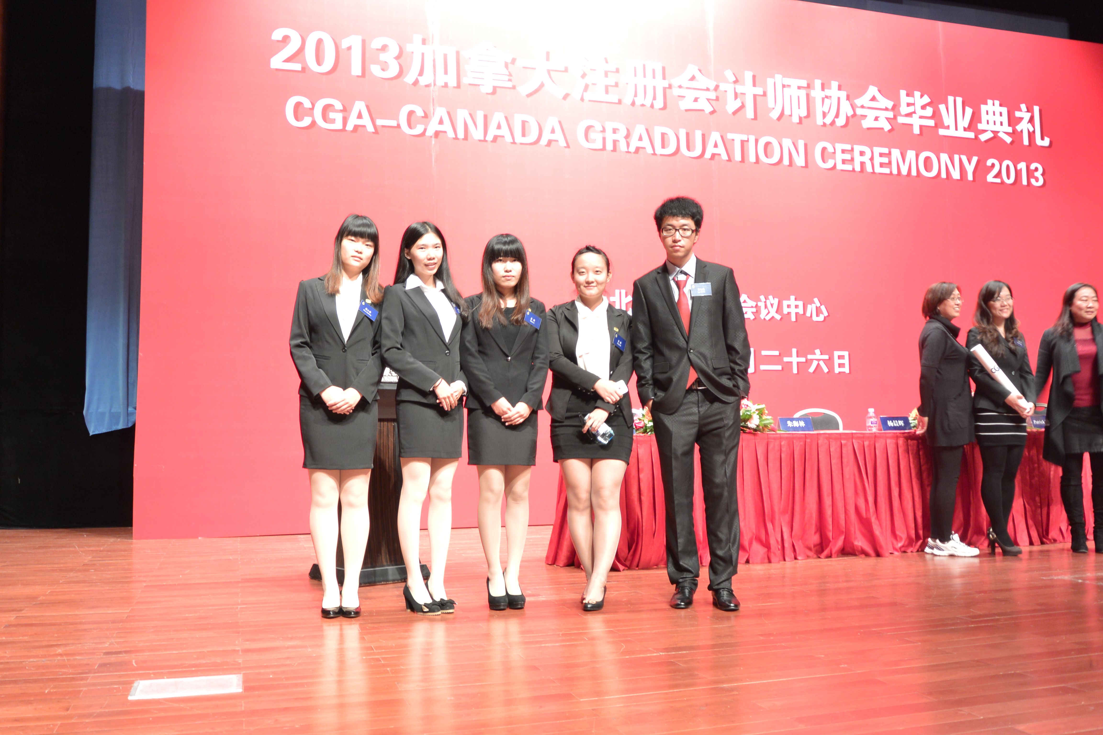 (撰稿:张子敏 审核:王华)2013年10月26日,2013加拿大注册会计师协会(CGA)毕业典礼在北京国家会议中心举行。会计学院CGA专业张楠、廖沁楠、孟烨、周小康、张子敏五位同学作为金帆国际俱乐部(简称TIC)会员出席并观摩了毕业典礼。