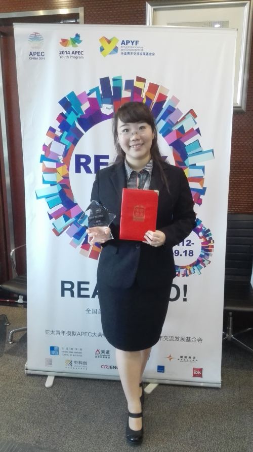 我院ACCA1101班黎晓雯同学从总决赛中脱颖而出,荣获全国总冠军。2014 MODEL APEC"Ready, Go!"商业挑战赛是APEC系列活动中唯一专门为APEC成员经济体的杰出青年举办的活动,也是由我国发起、影响深远的重要公共外交活动品牌项目。该项目号召更多青年积极参加国家重大事件,为培养未来青年领袖探寻积极的道路,更好地使我国的青年深度参与公共外交事务,拓宽国际视野,快速成长成才贡献积极的力量。