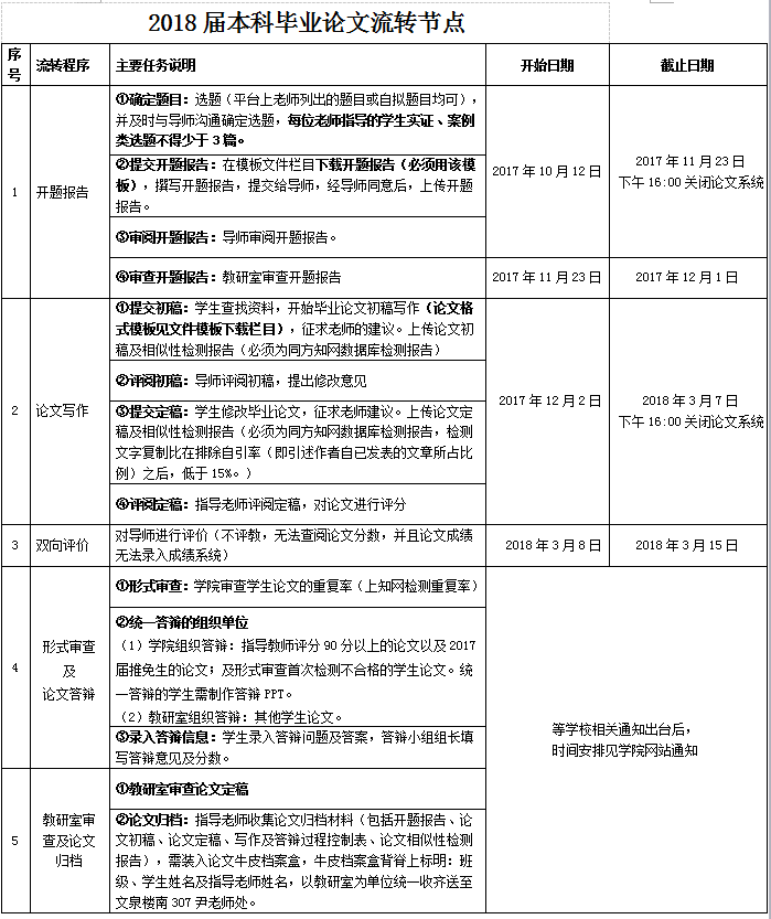 学院已在论文系统中设置各阶段的时间节点(如下表),请指导教师和学生严格遵照相关的时间要求进行,到期关闭论文系统。