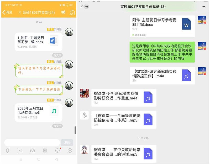 会硕1803党支部、审硕1901党支部将“音频党课”融入线上主题党日。会硕1803党支部书记刘路遥以深入学习习近平总书记关于疫情防控重要讲话和指示批示精神为主题,录制了15分钟“微党课”,审硕1901党支部委员分工合作,为每一份学习资料录制了领学音频,力求在互联网的虚拟空间中营造更加浓厚的学习氛围、提供更有质量和形式多样的学习内容。
