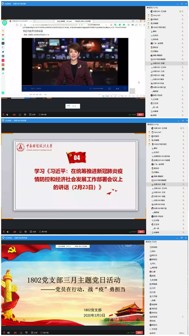 会硕1801党支部、会硕1802党支部通过qq语音多人实时通话功能线上开展主题党日活动;审硕1902党支部在学习强国平台开展线上主题党日活动,其他支部则选用了微信群、qq群等平台进行“直播”式学习,既符合当前疫情防控实际,又兼具实效性和仪式感。